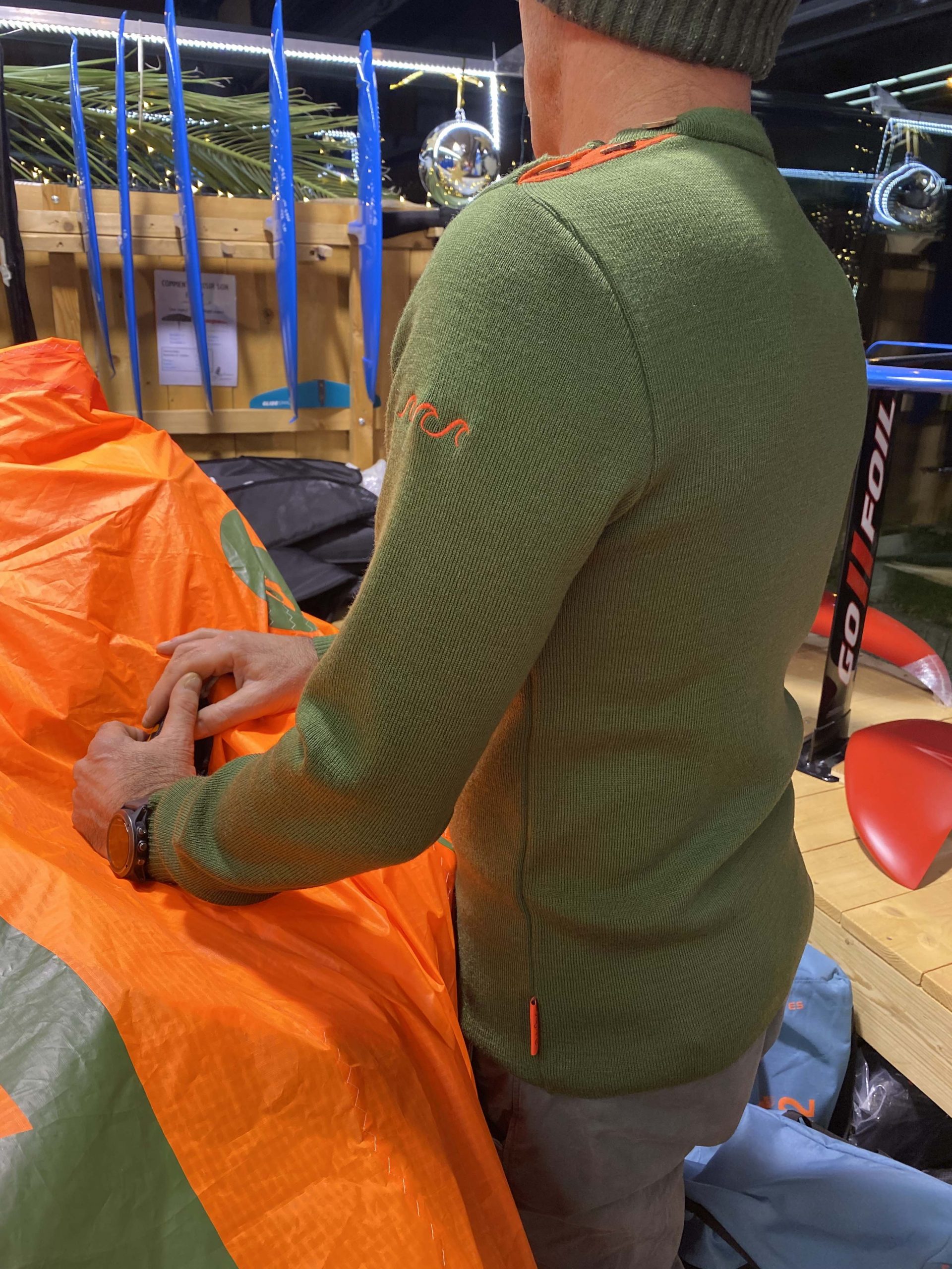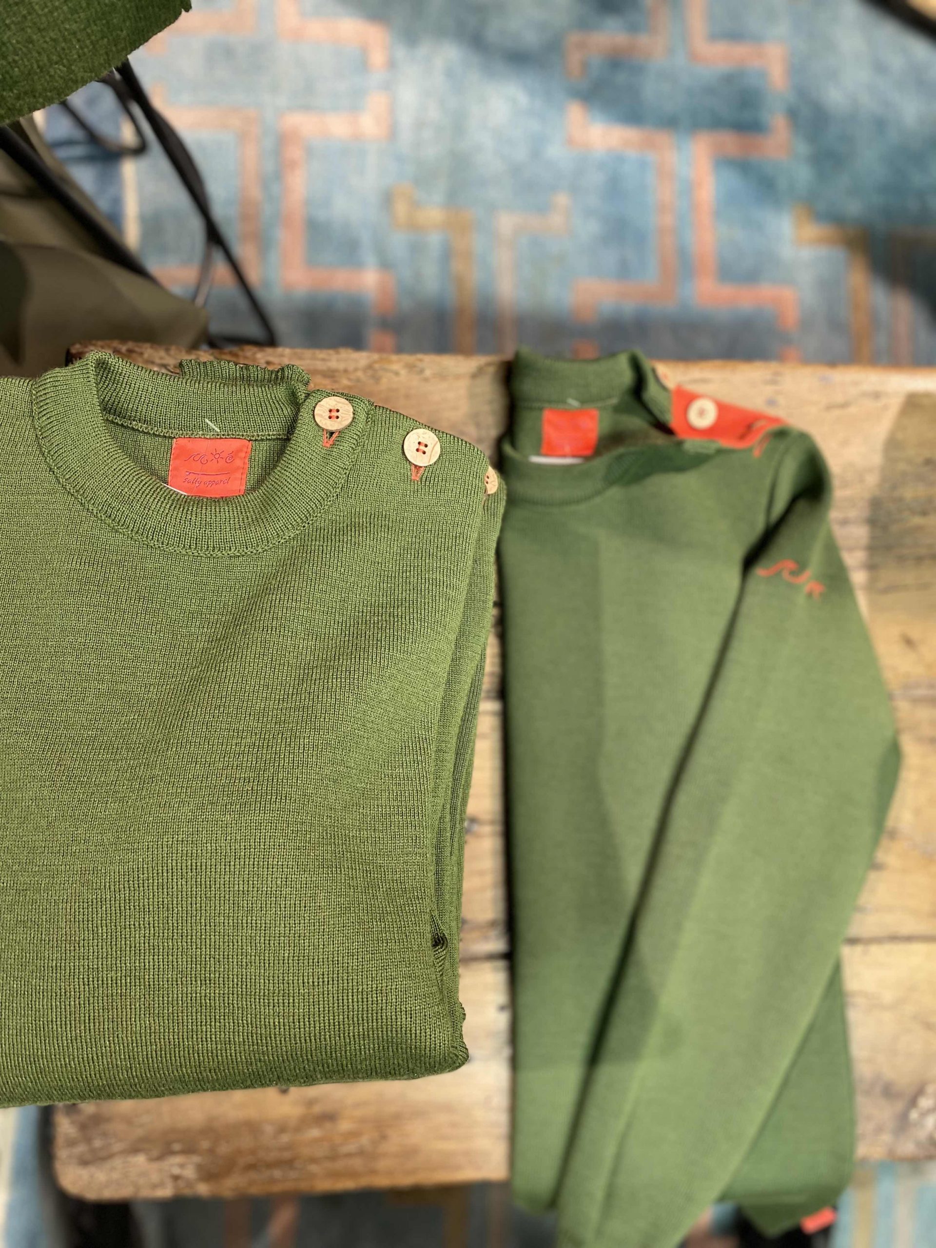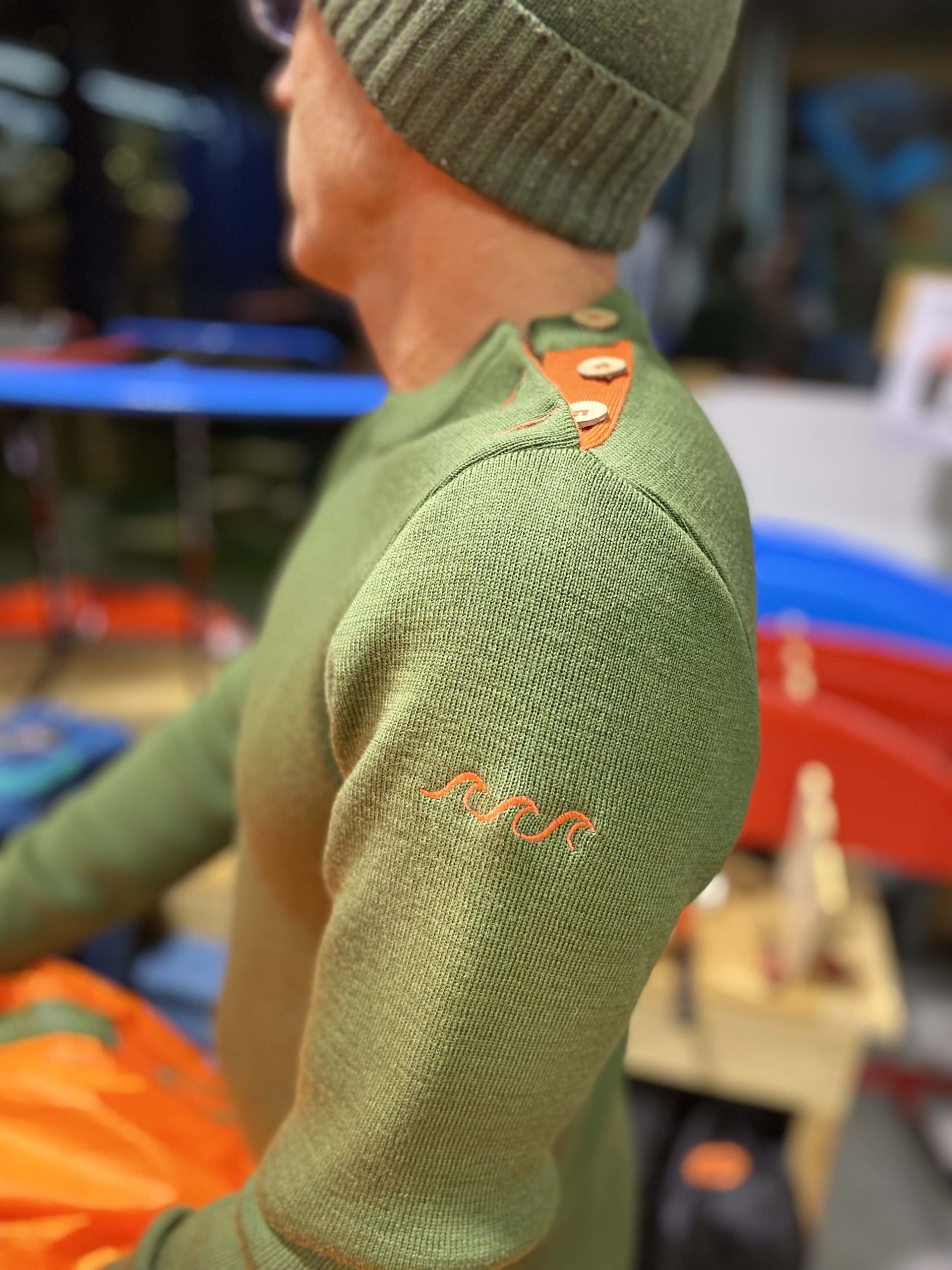Pull coupe droite, en 100% laine, très qualitatif, thermorégulateur. Le pull marin classique, coupe près du corps, un pull intemporel à la qualité inégalée. Détail fun orange manche, patte de boutonnage et étiquette assorti. Coloris Kaki, détails orange
